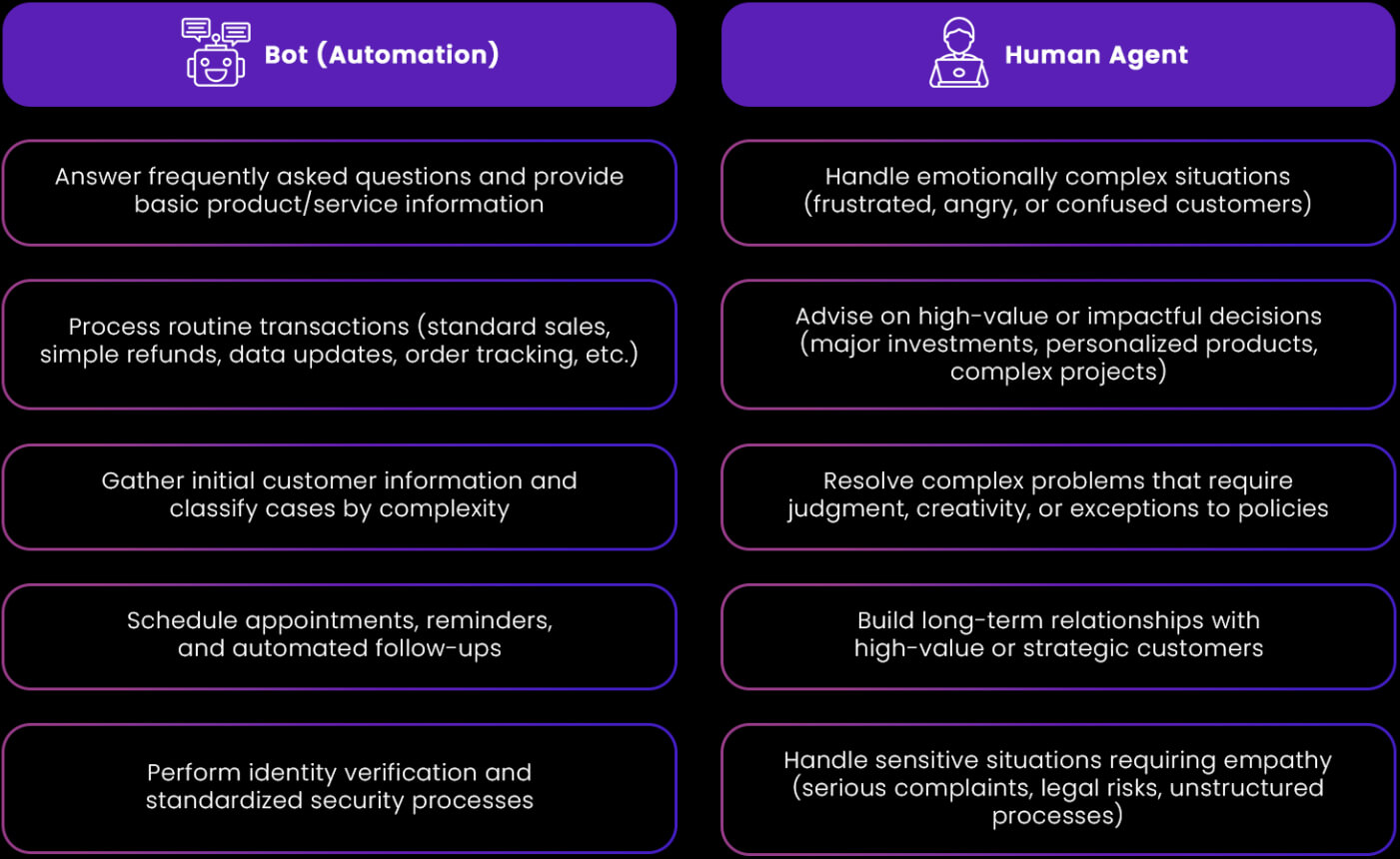 For example, routine inquiries such as order tracking, account updates, or simple refunds are perfect candidates for automation. However, complex decisions, sales objections, or customer frustration require immediate human intervention.