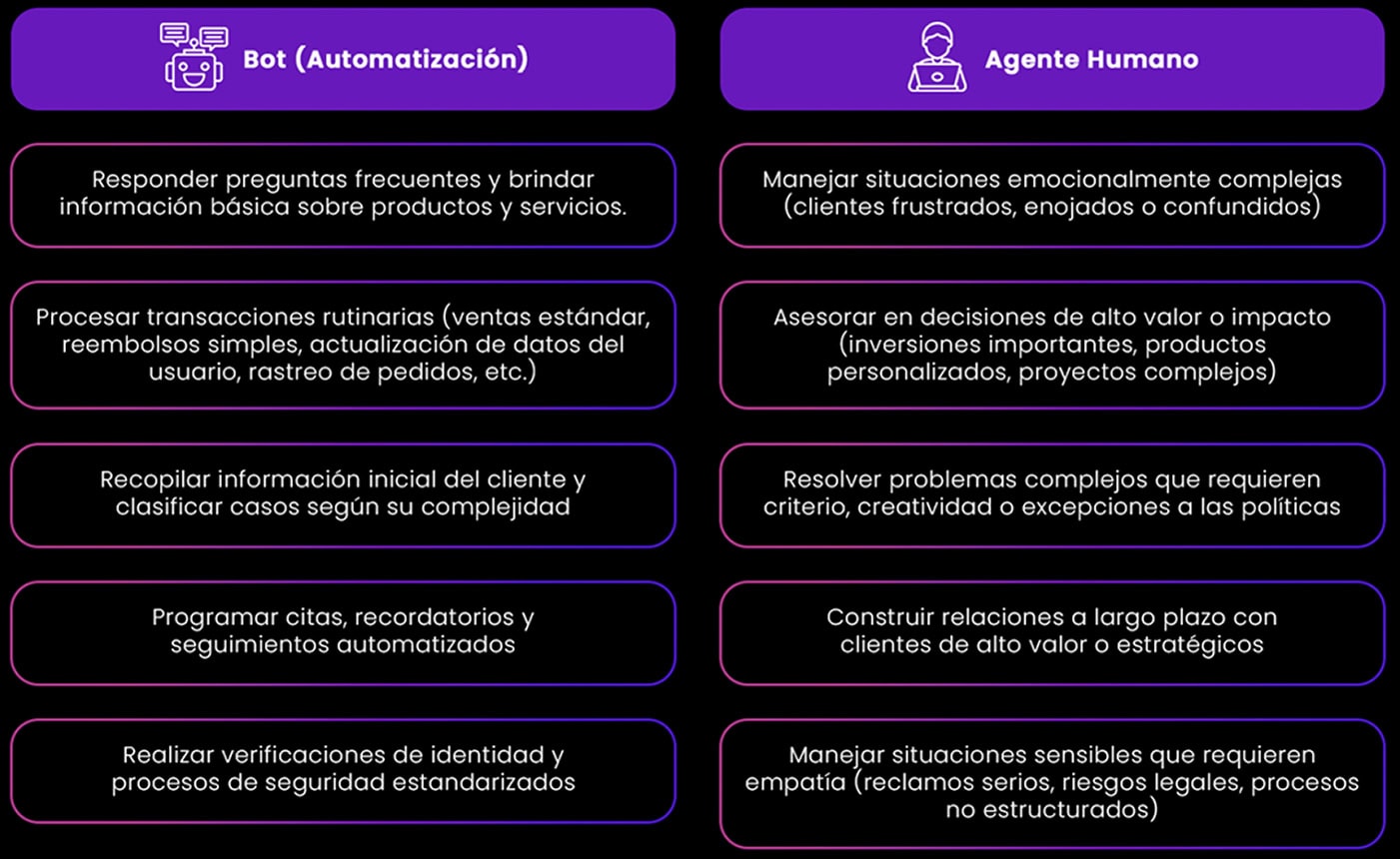 Esta asignación de tareas permite que la IA se encargue de las tareas repetitivas y de alto volumen, mientras que los humanos aportan el valor diferencial en situaciones donde se requiere inteligencia emocional, criterio y personalización.