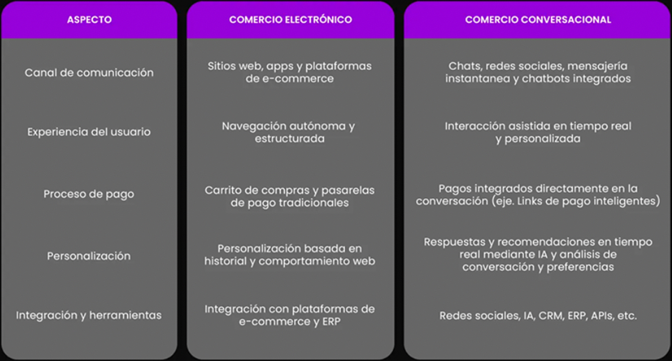• Comercio Conversacional: La compra es más parecida a la compra en una tienda física. El cliente comparte al agente sus necesidades y el agente o bot le ofrece los productos que se adecuan a sus necesidades. Todo ocurre de manera digital por medio de un chat. Los pagos se realizan por medio de un link de pago seguro que permite que la conversión y pago se ejecute sin dejar la conversación.